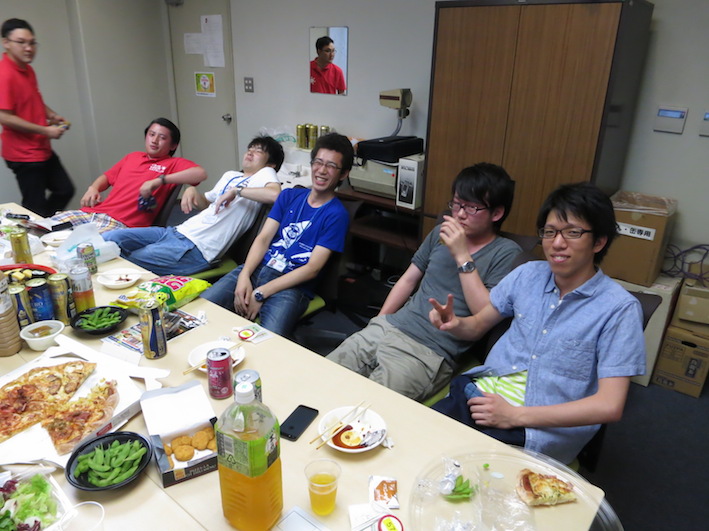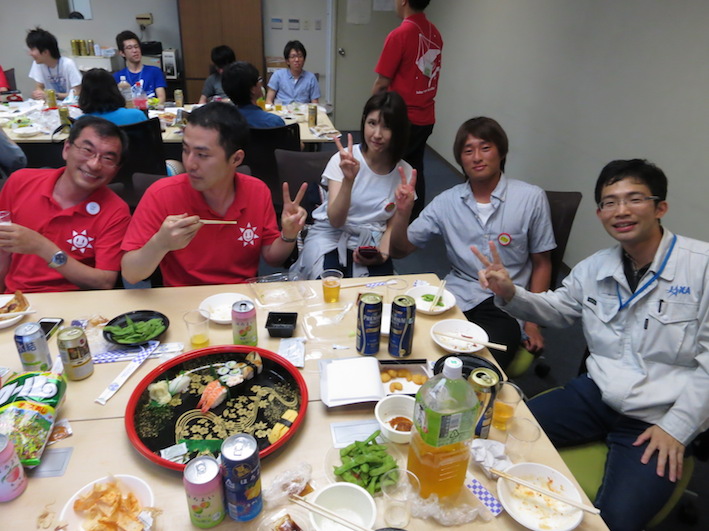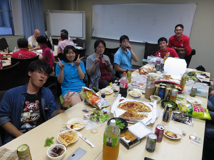 終了後の打ち上げ会にて。公開前日に夜遅くまで準備をしていた学生もいて、みんな頑張りました。また、打ち上げ会にはOB/OGや関係者の方々も大勢参加してくれて、とても賑やかになりました。